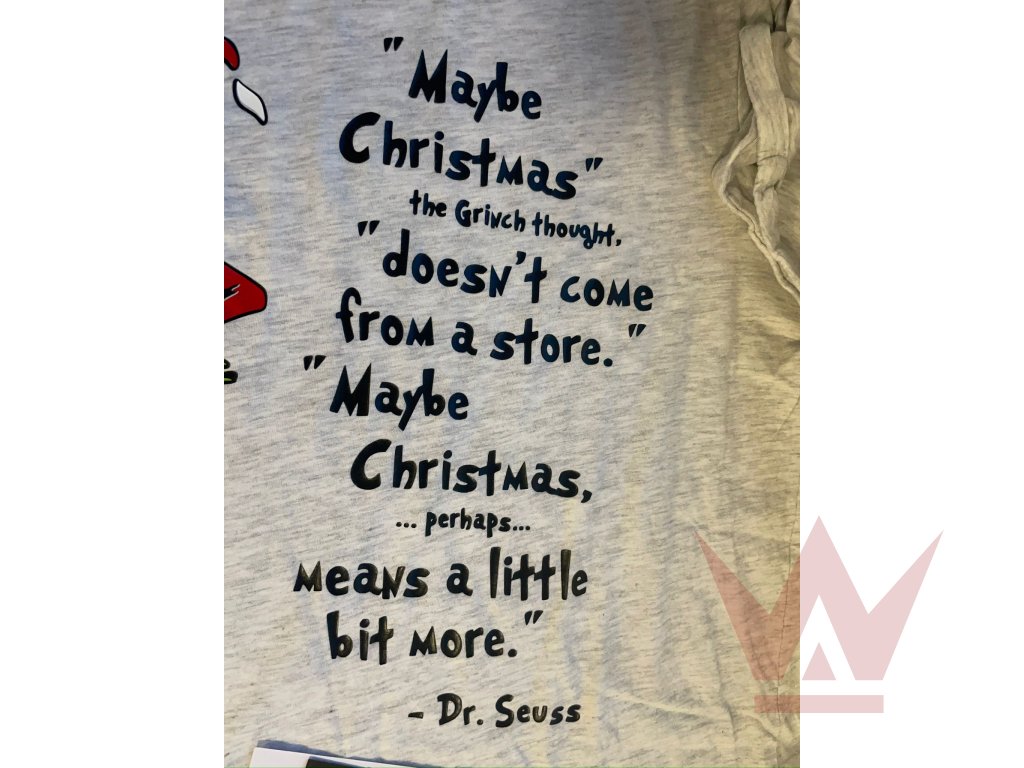 Tričko s Grinchem a slovy “Maybe Christmas,” the Grinch thought, “doesn’t come from a store. Maybe Christmas perhaps means a little bit more.” – ideální pro každého, kdo chce nosit vánoční poselství s humorem i srdcem.